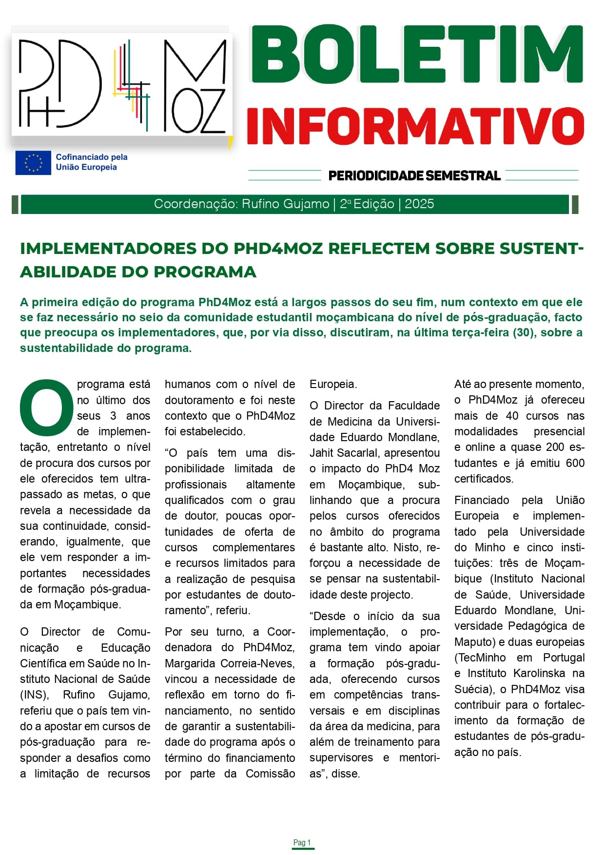 A newsletter PhD4Moz assume-se, assim, como um instrumento estratégico de comunicação, aproximando a comunidade académica, os parceiros institucionais e o público interessado, ao mesmo tempo que reforça a missão do programa de contribuir para o desenvolvimento do ensino pós-graduado e da investigação científica em Moçambique.