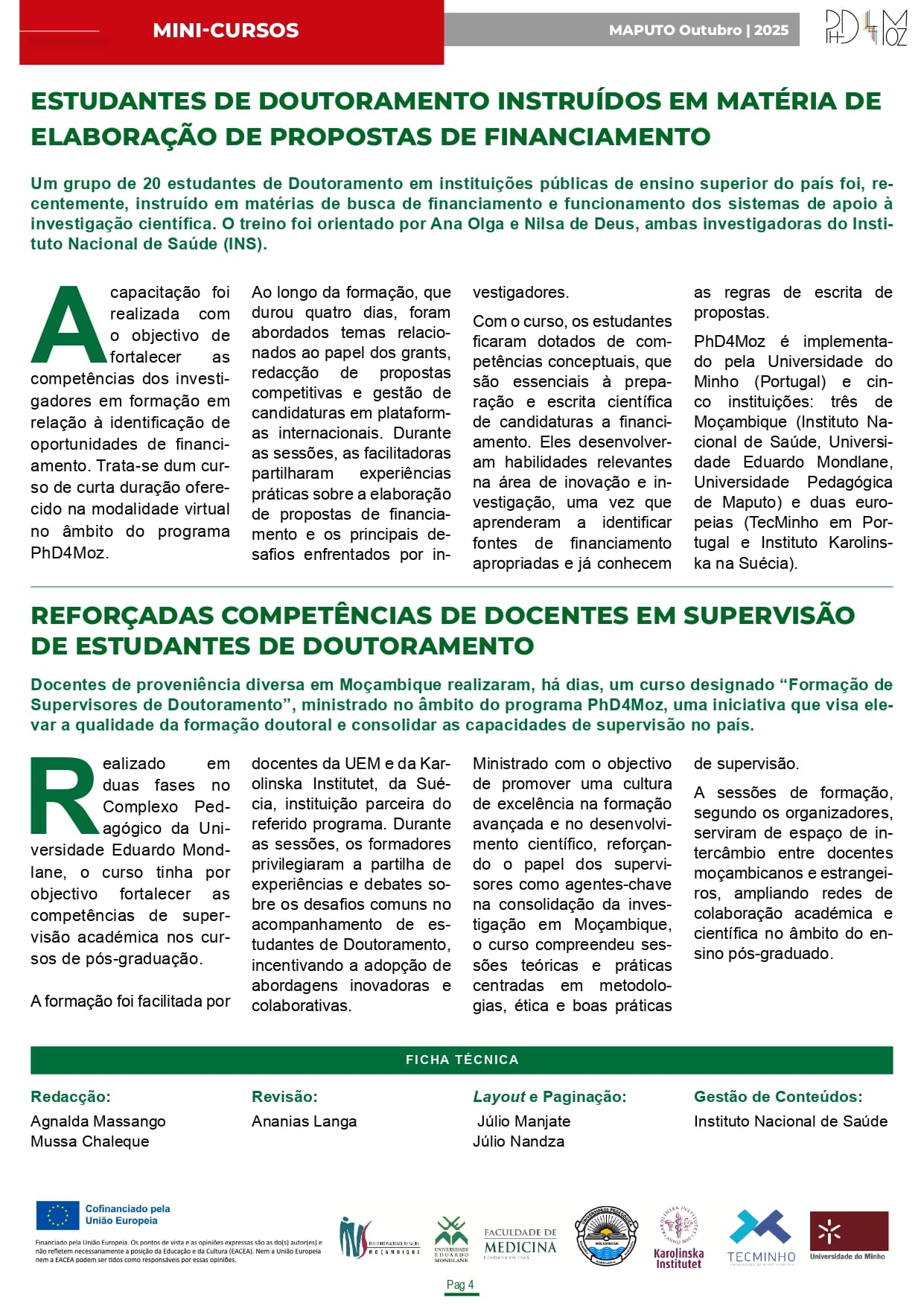 Esta edição reúne os principais destaques das ações desenvolvidas recentemente no âmbito do PhD4Moz, incluindo iniciativas de formação, eventos científicos, reflexões institucionais e testemunhos de estudantes e docentes beneficiários do programa. A newsletter evidencia, igualmente, os esforços em curso para o fortalecimento das competências científicas, académicas e profissionais de estudantes de doutoramento, bem como o papel das instituições parceiras na consolidação da formação avançada no país.