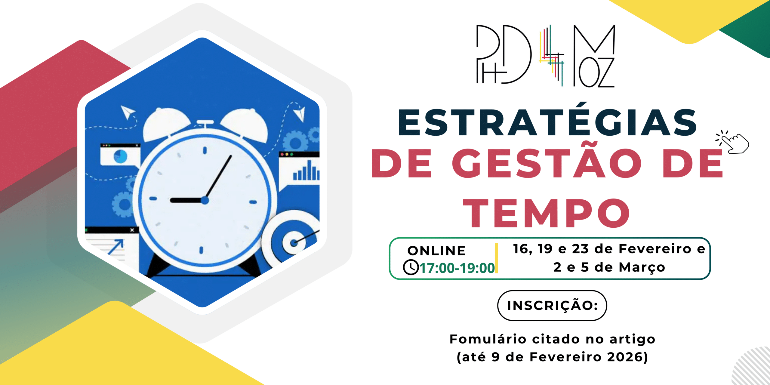 No âmbito do projeto PhD4Moz, estão abertas as inscrições para o Curso de Estratégias de Gestão de Tempo, que decorrerá nos dias 16, 19 e 23 de fevereiro, e 2 e 5 de março de 2026, em formato online.